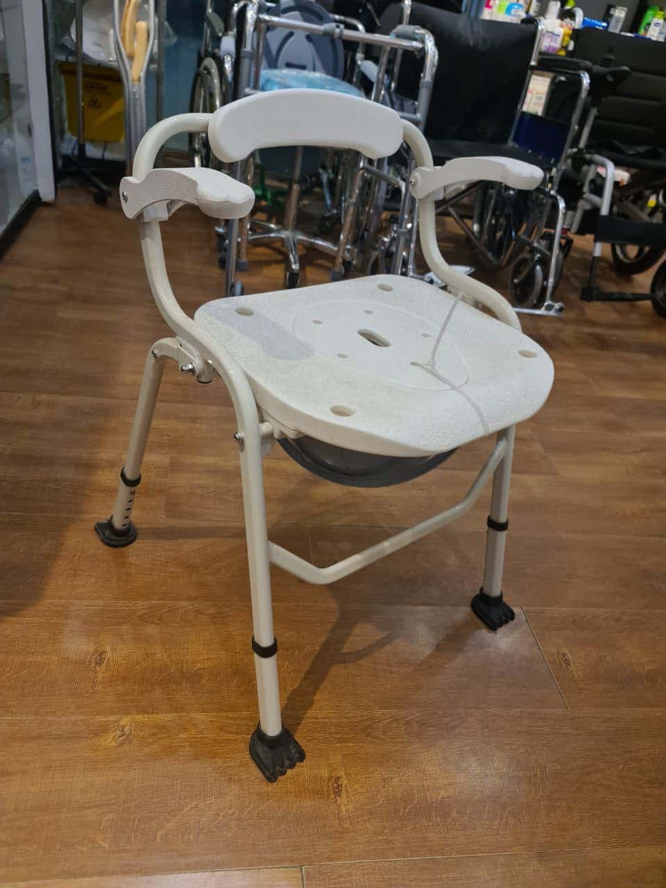 Positionnée dans la chambre, elle fonctionne comme une chaise garde-robe classique, complète avec son sceau pour une utilisation aisée. Dans les toilettes, elle se transforme en un cadre de WC avec accoudoirs, offrant également la possibilité d’être utilisé comme rehausseur de toilettes grâce au réglage en hauteur des pieds.