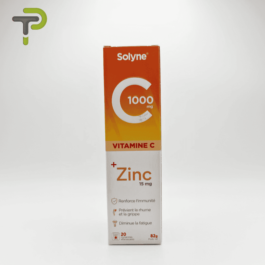 Solyne 1000 mg, une combinaison puissante de Vitamine C (1000 mg) et de Zinc (15 mg), agit en renforçant l’immunité pour prévenir le rhume et la grippe. Les 20 comprimés effervescents de 82g offrent une solution pratique et délicieuse tout en aidant à diminuer la fatigue. Un allié idéal pour soutenir votre bien-être quotidien.