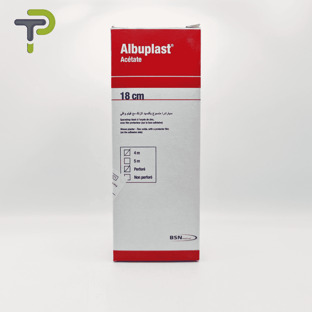 Le Sparadrap ALBUPLAST 18CM*4M est un adhésif médical composé d’un support de cellulose rigide, facilement sécable à la main dans les deux sens. Il est enduit sur une face d’une masse adhésive contenant du caoutchouc naturel et de l’oxyde de zinc, assurant une adhérence efficace à la peau par simple pression. Destiné à la fixation de tubulures et de matériels de soins, il est également utilisé pour le maintien sécurisé des pansements.
