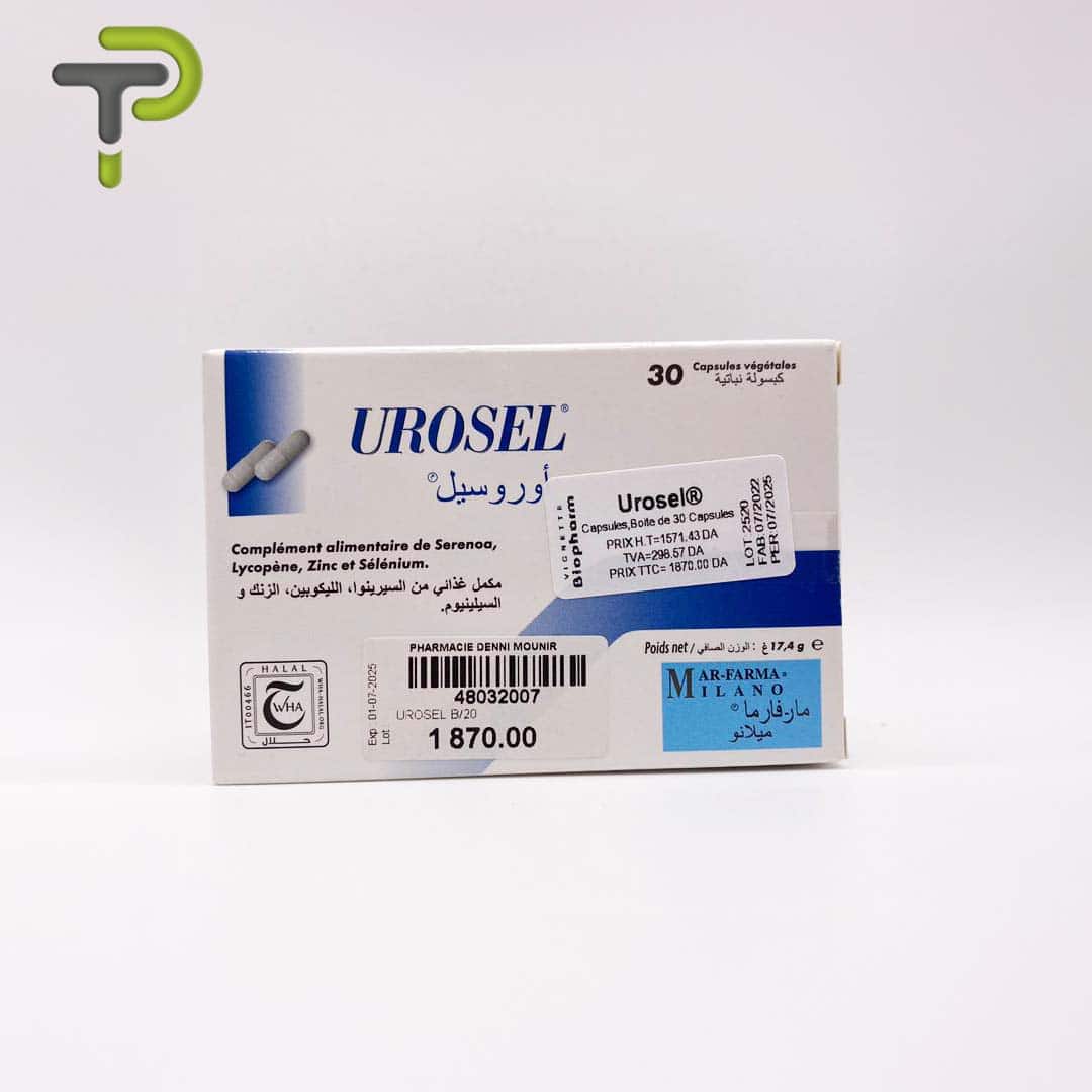 UROSEL est un complément alimentaire halal contenant de la Serenoa, du Lycopène, du Zinc et du Sélénium, favorisant la santé masculine. Chaque boîte contient 30 capsules végétales, formulées par Biopharm VIGNE, pour un bien-être quotidien.